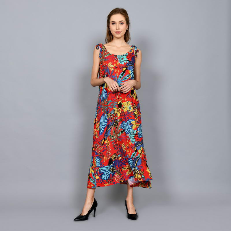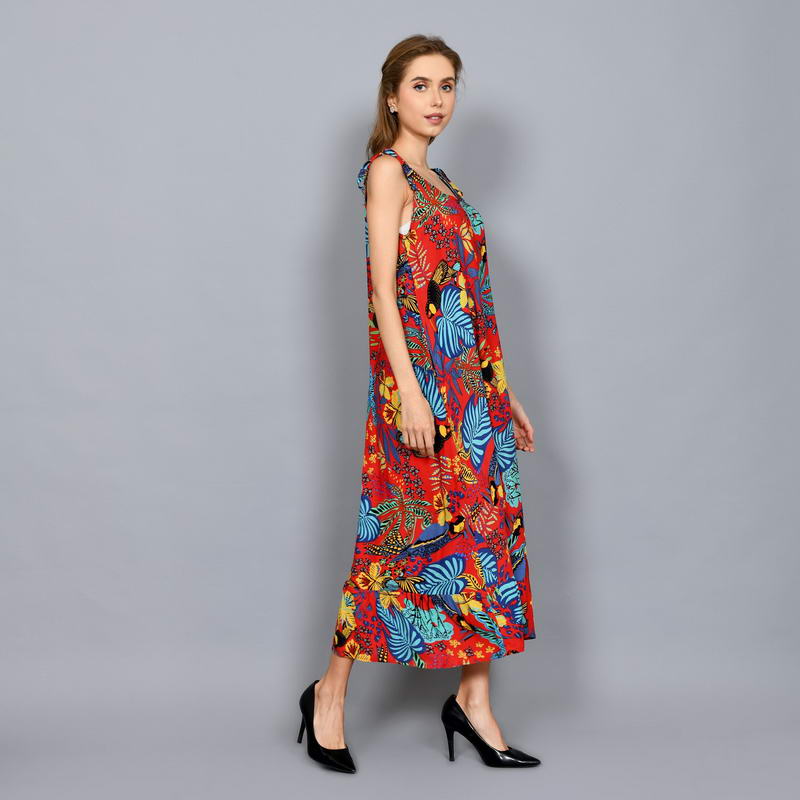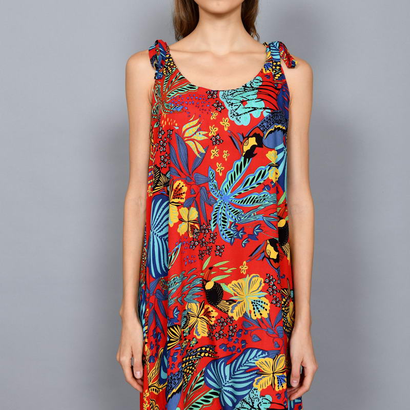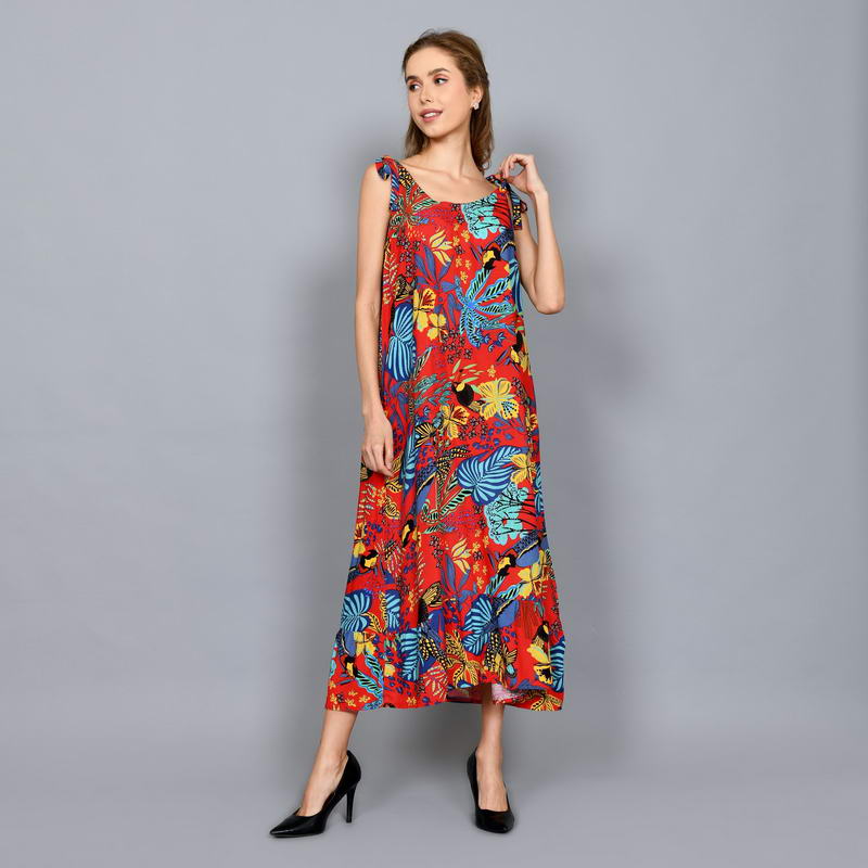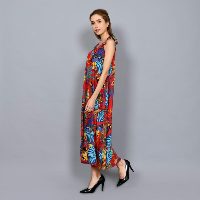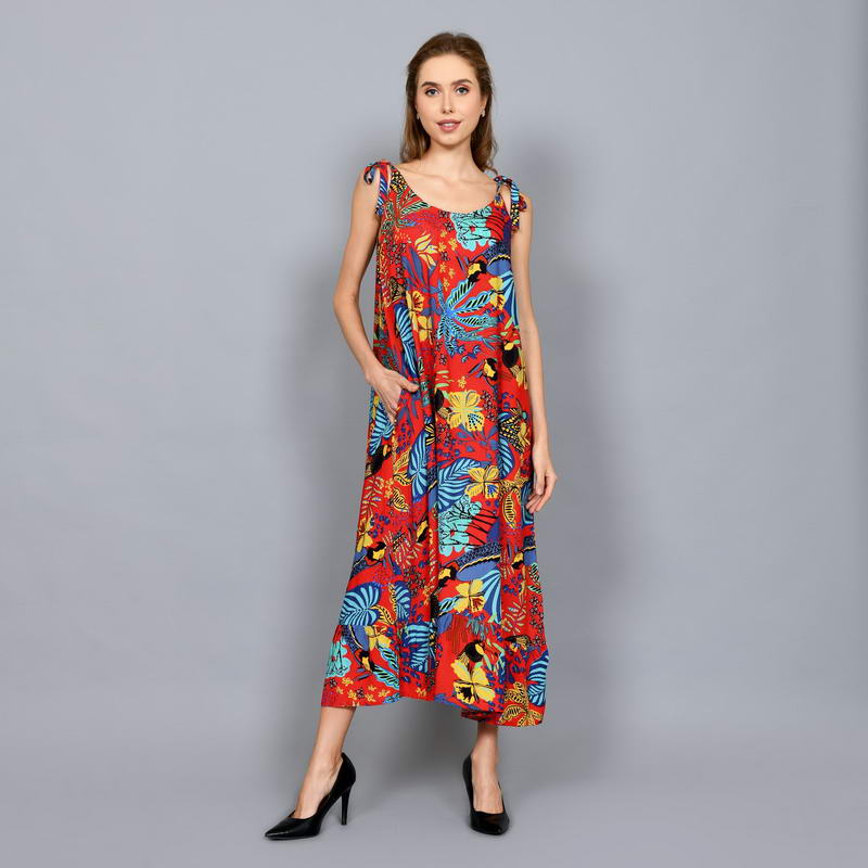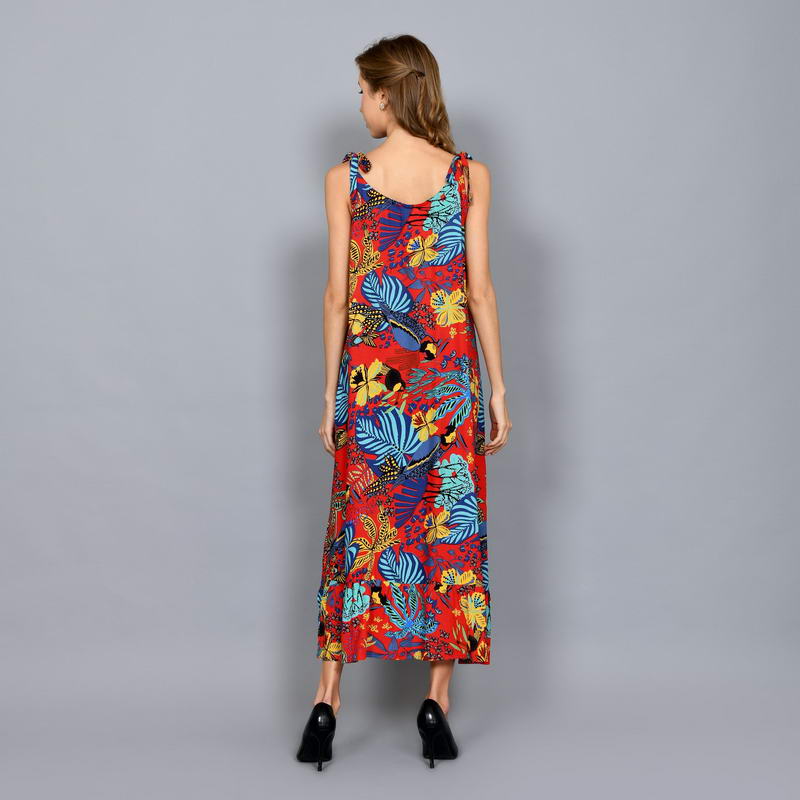 Tropical Printed Sleeveless Shift Maxi Dress with Shoulder Tie Straps DRN001-018BI