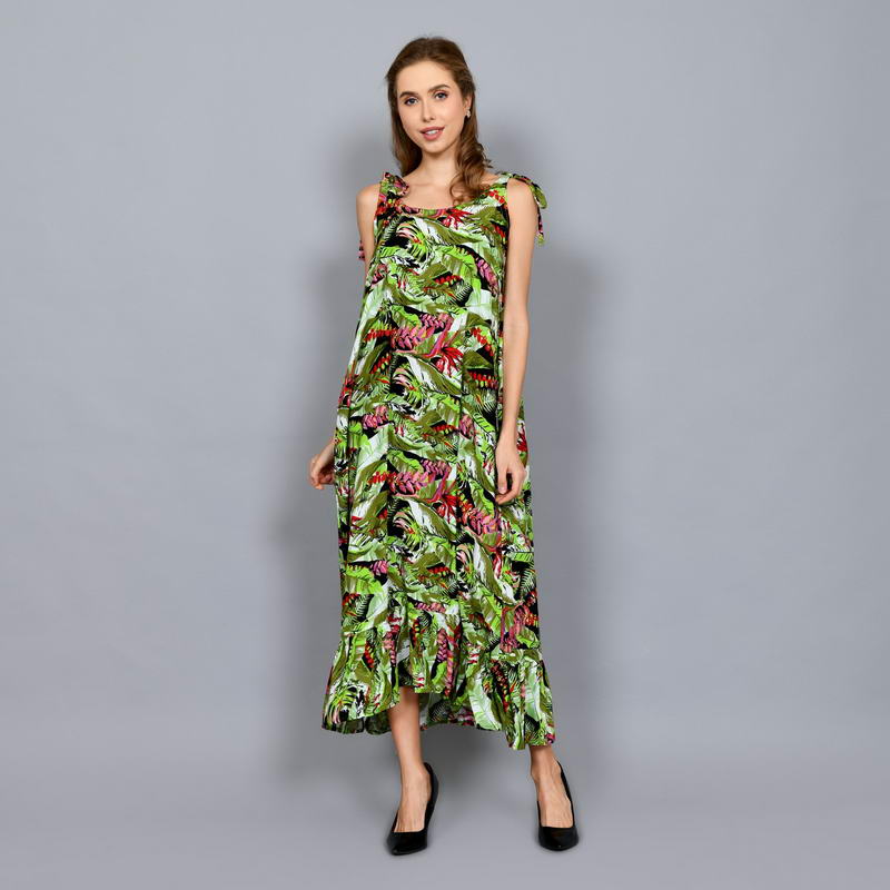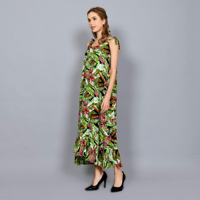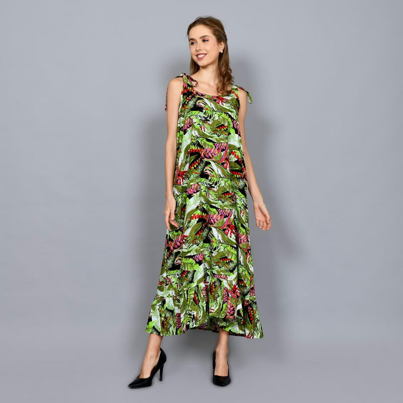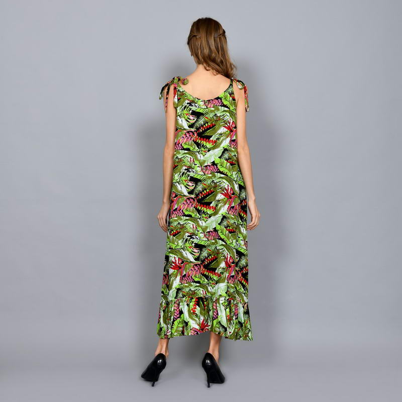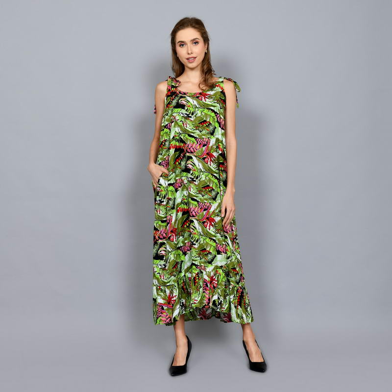 Tropical Printed Sleeveless Shift Maxi Dress with Shoulder Tie Straps DRN001-019BI
