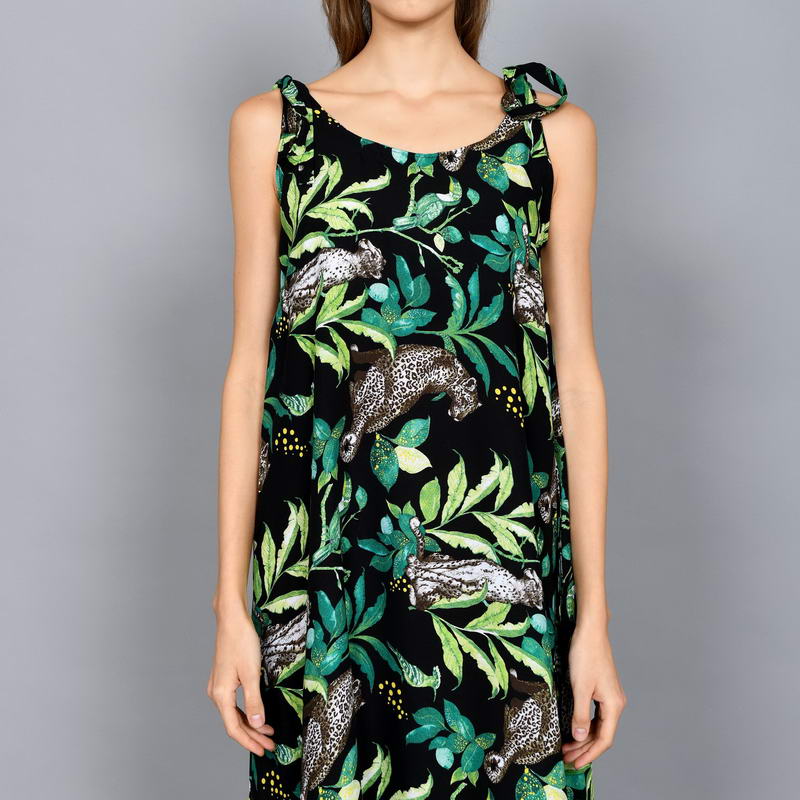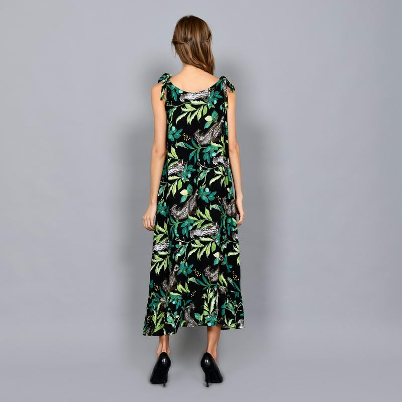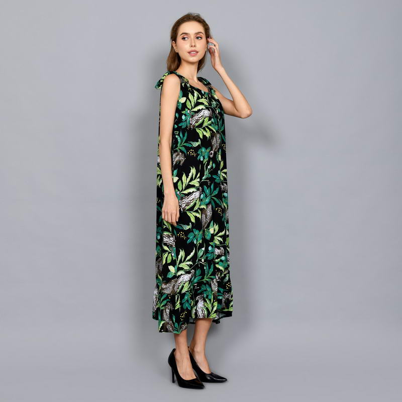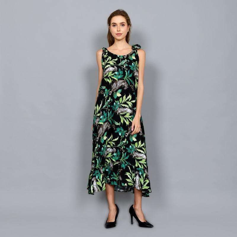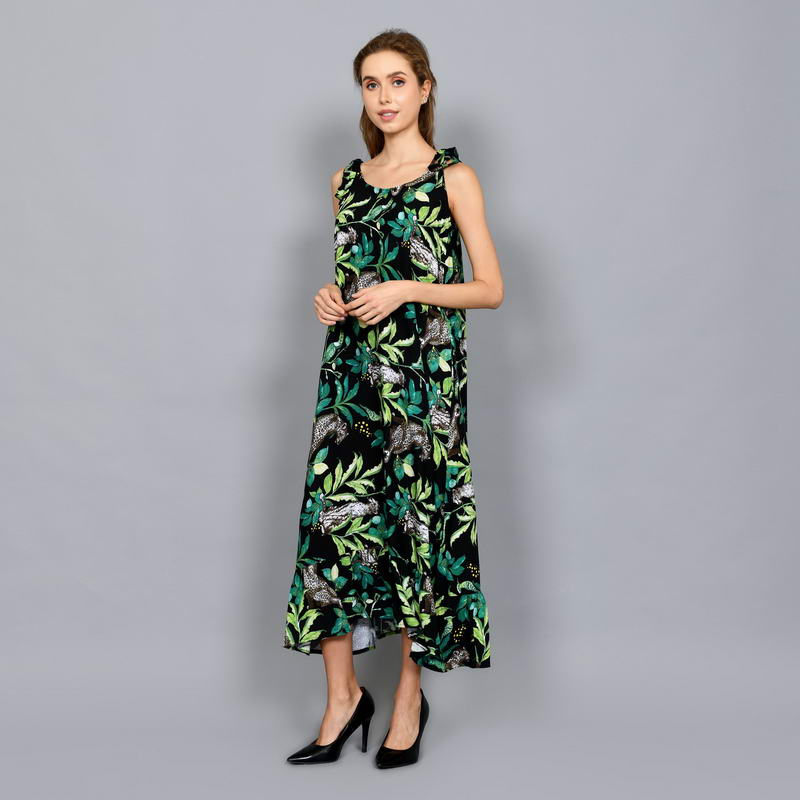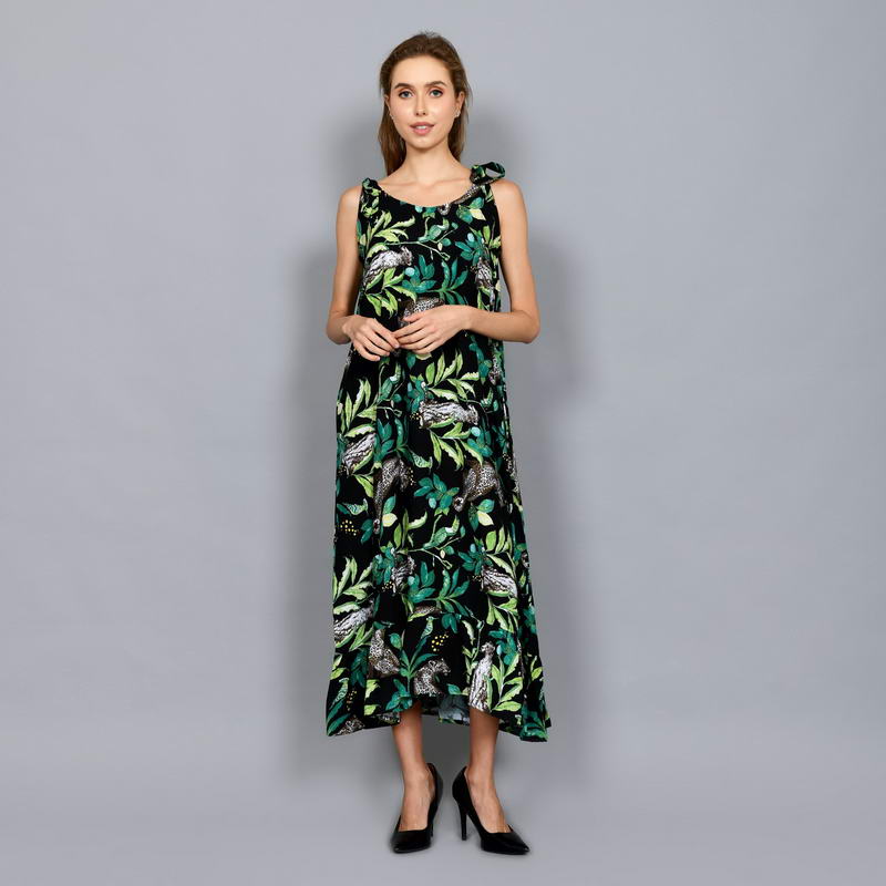 Sleeveless Tropical Printed Maxi Dress - Black, Shift Style with Hidden Pocket