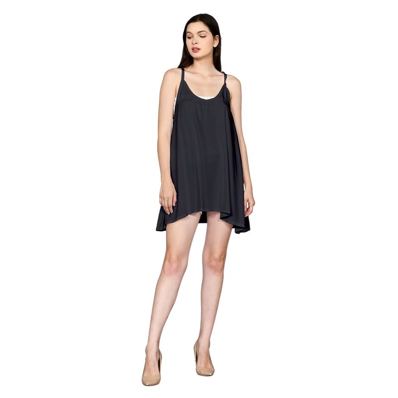 Comfy Beachwear Mini Dress with Shoulder Tie Spaghetti Straps and Deep V Neck Detail in Solid Black for Summer Holiday Outfit DRN010-001R1