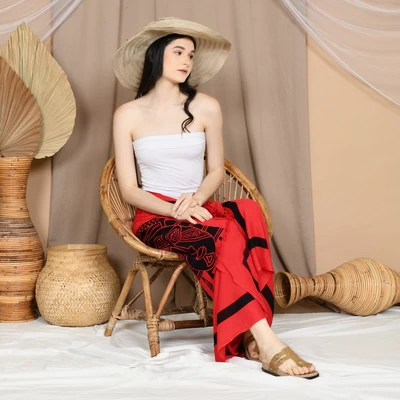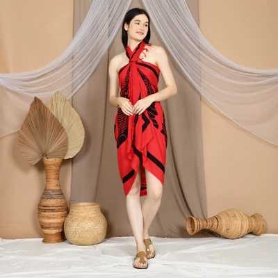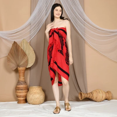 Red Black African Ethnic Print - Hawaiian Bali Sarong Pareo Batik Beach Swim Wrap Cover Up with Fringe - 175 x 115cm