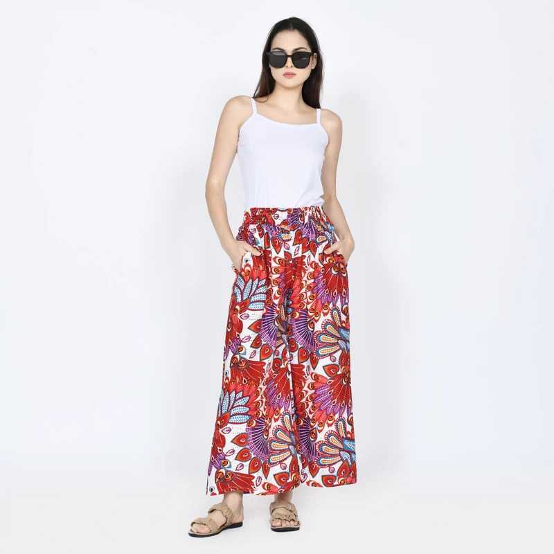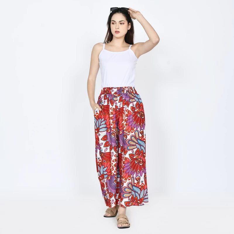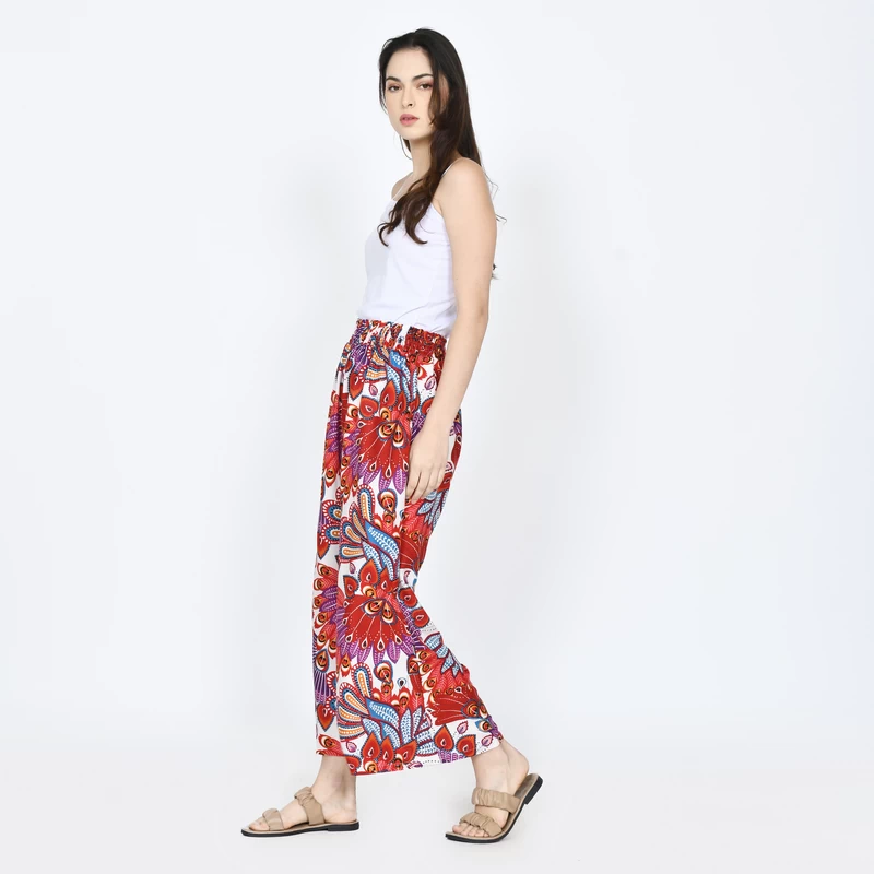 Tropical Printed Pattern Straight Leg Pants with Shirred Waist PT011-021BI - PT011-021BI