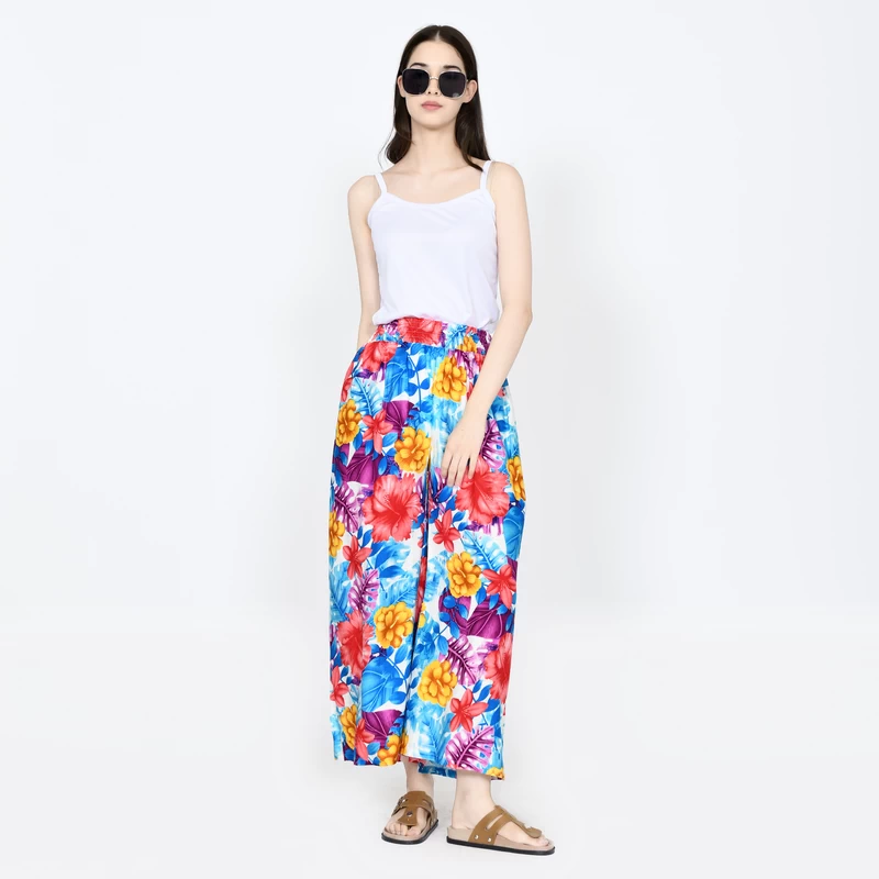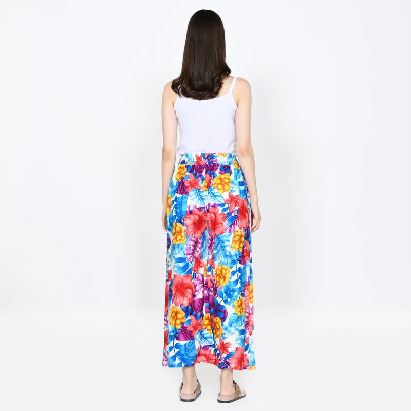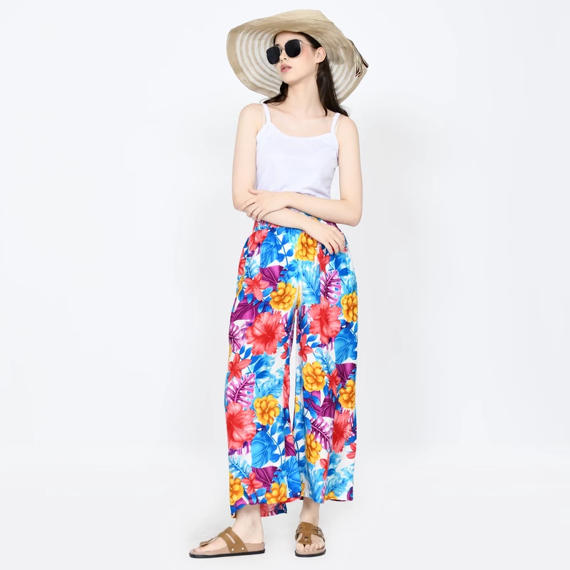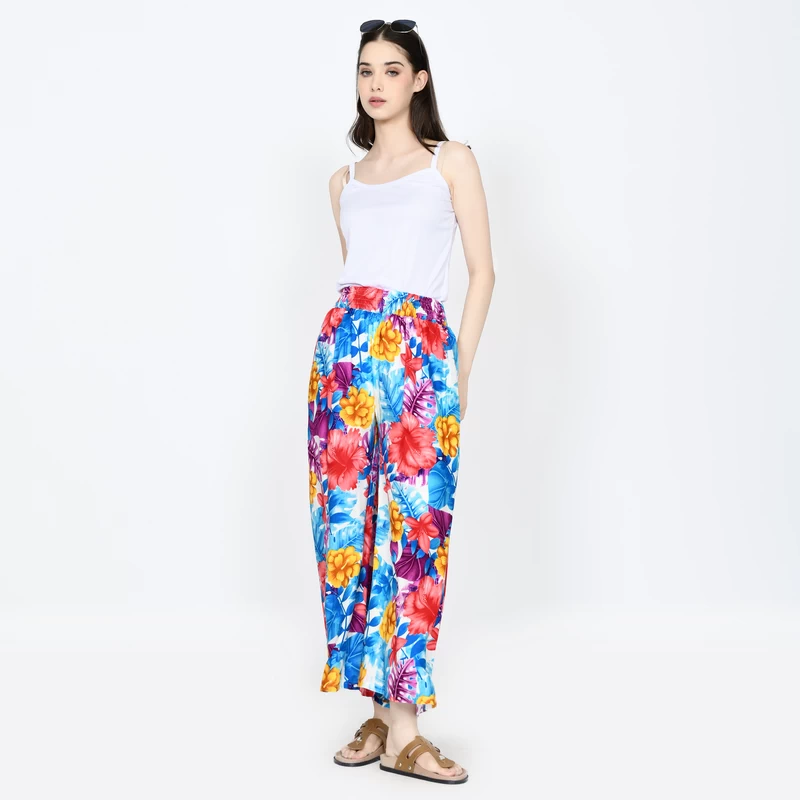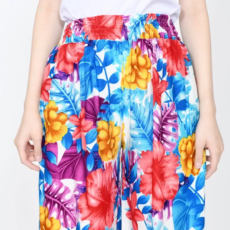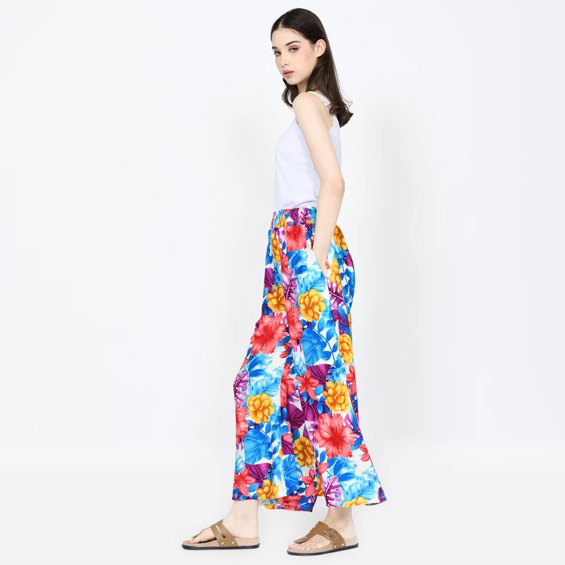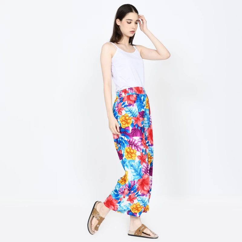Women's Tropical Printed Straight Leg Pants with Shirred Waist and Front Tie Straps PT011-018BI - PT011-018BI