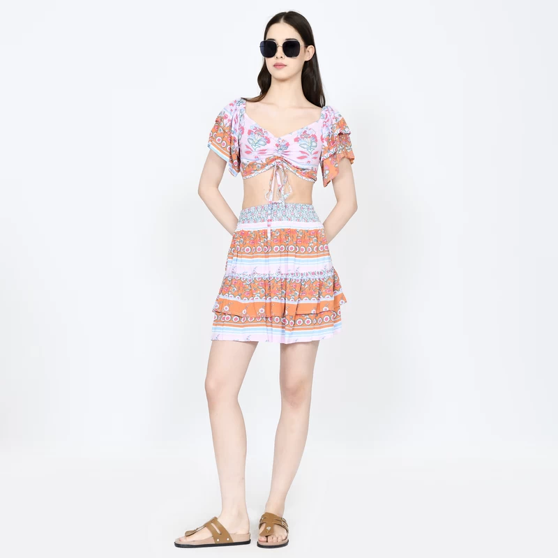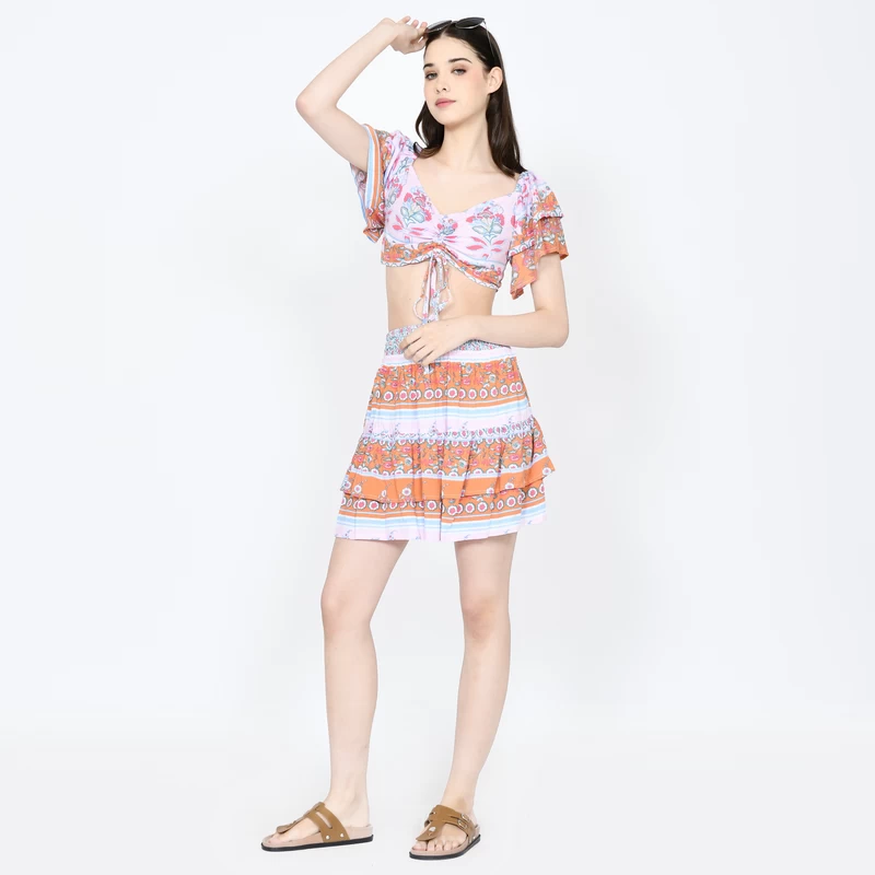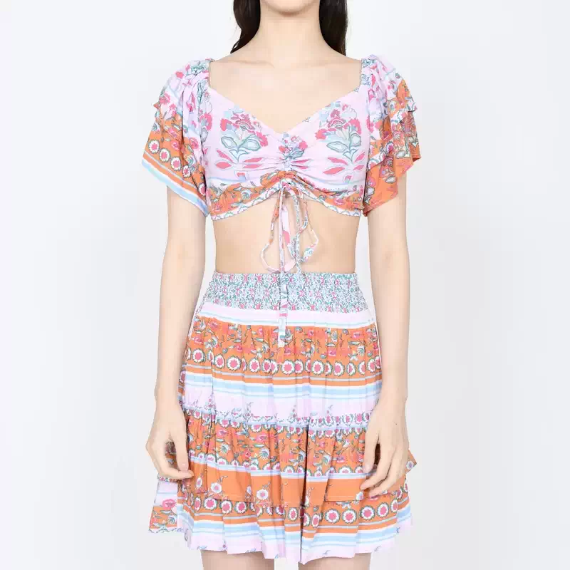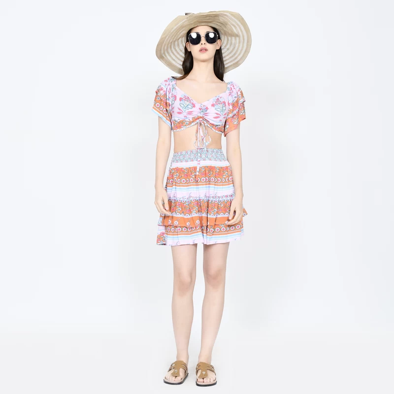 Womens Outfit Sets with Slim Fit 3/4 Sleeve Crop Top and Flowy White A Line Skirt ST004-000R1 - ST004-000R1